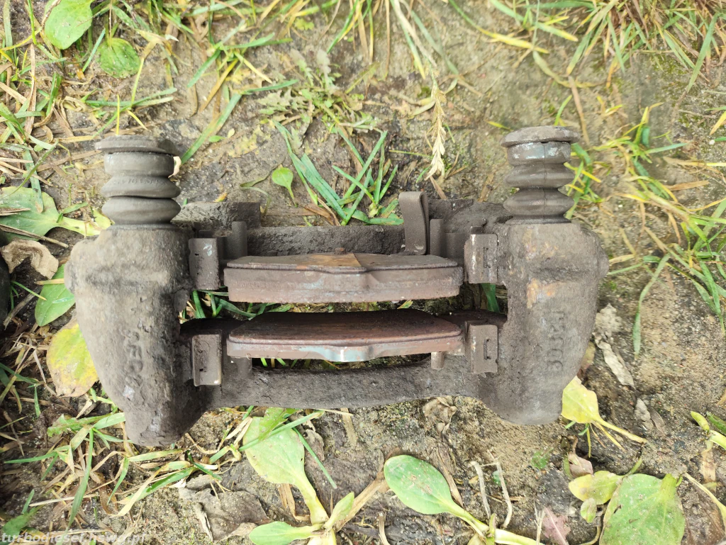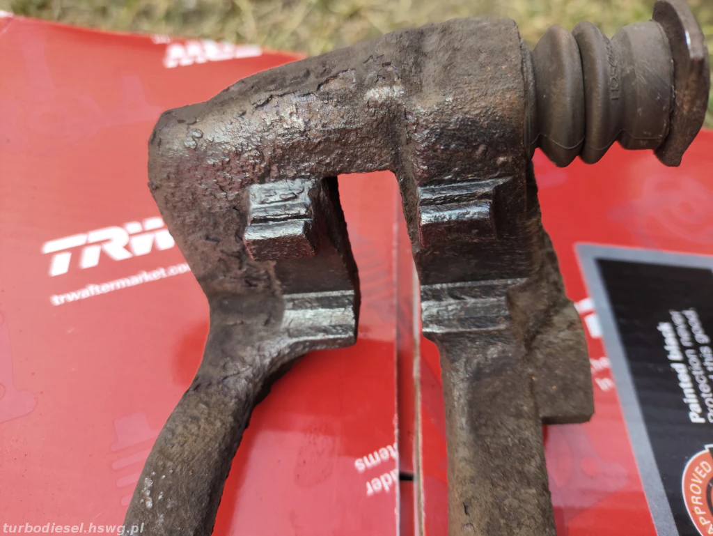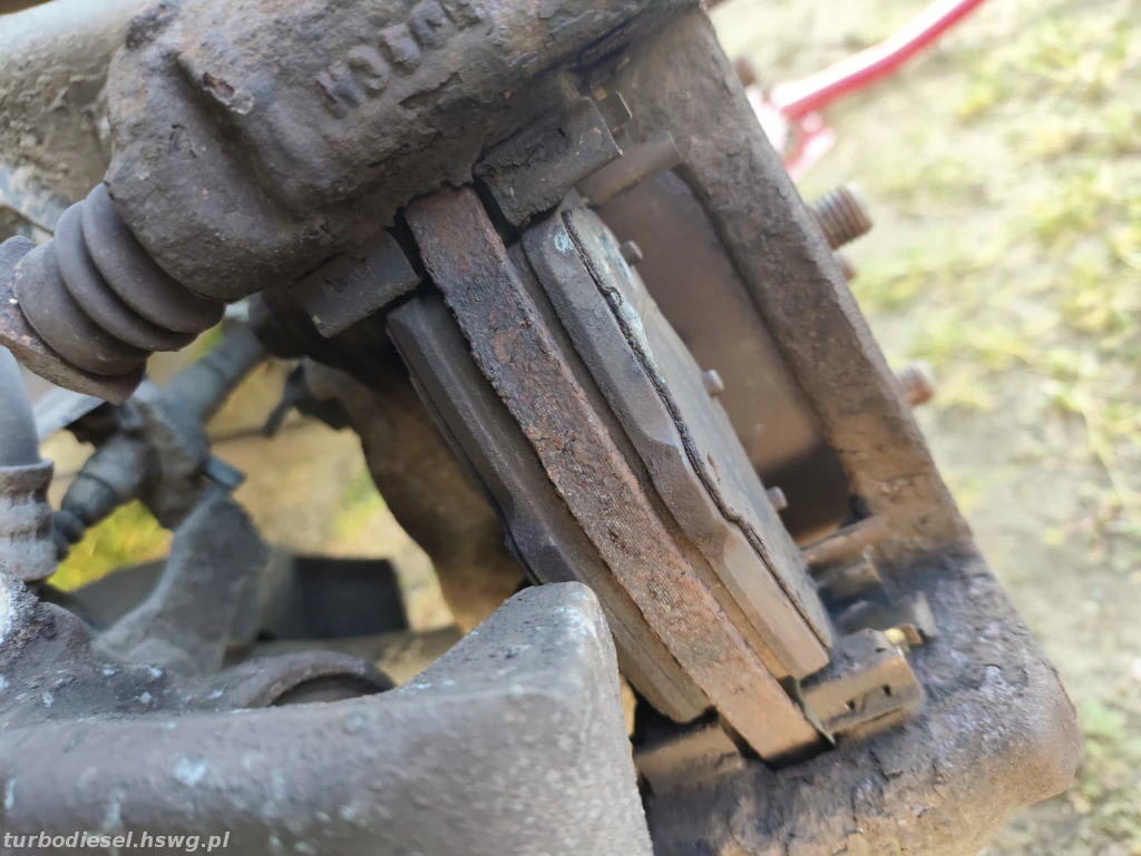 Na zdjęciu wyraźnie widać, że zewnętrzny klocek jest bardziej zużyty od wewnętrznego. Powód – stał dęba w jarzmie, trzeba było trochę powalczyć, żeby go wyjąć.