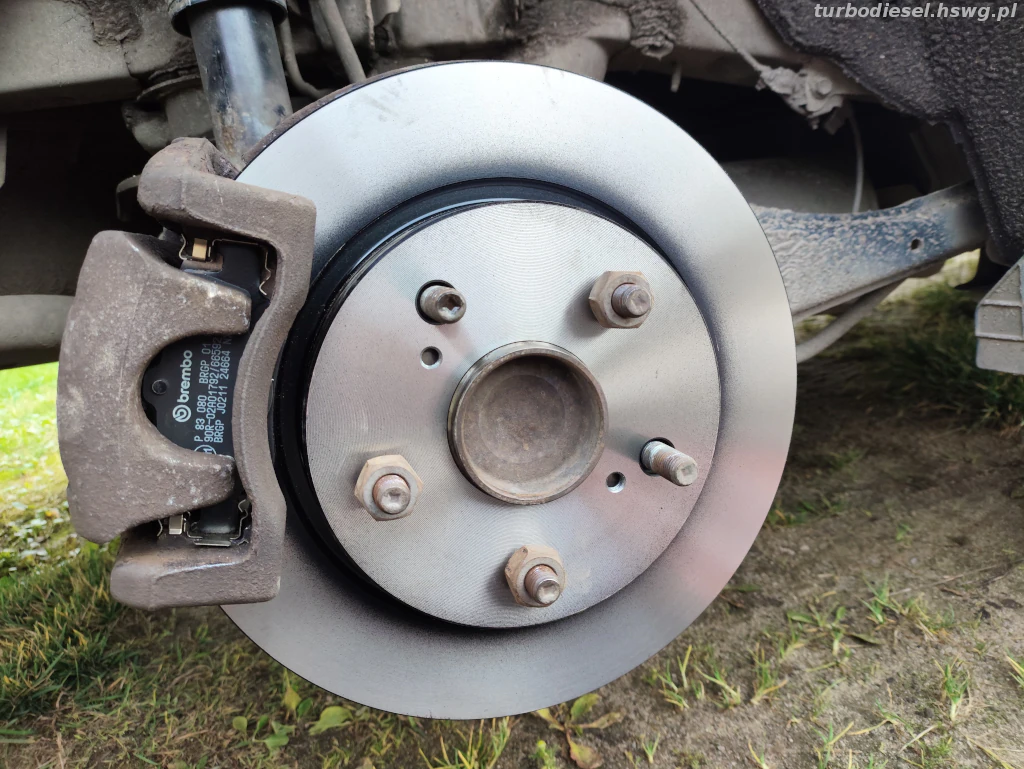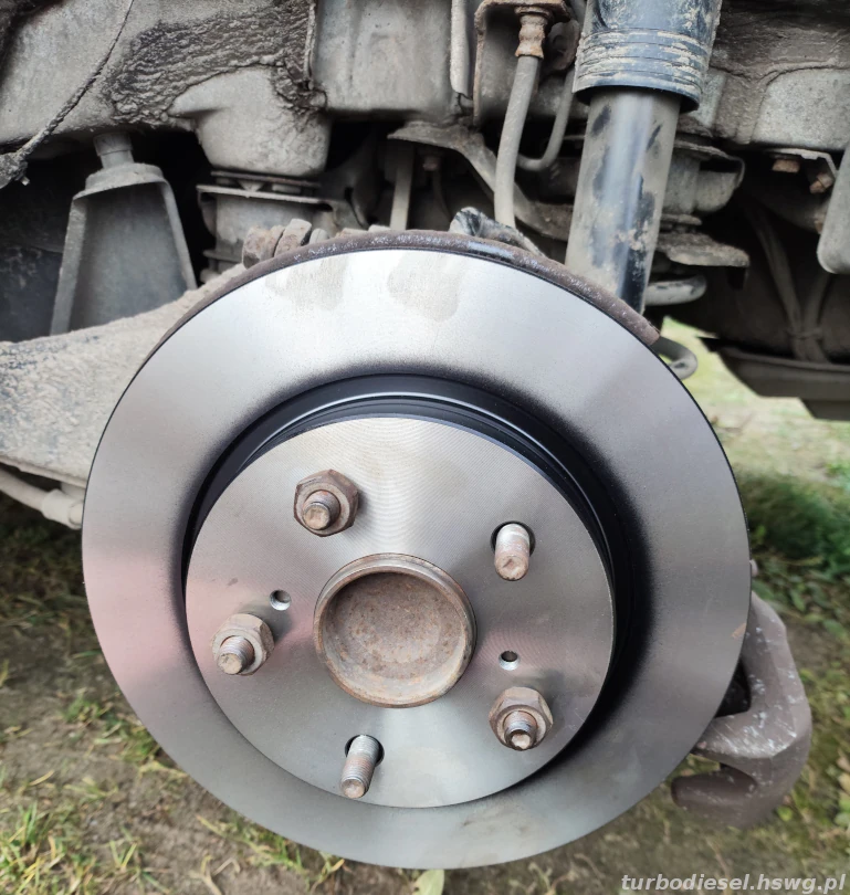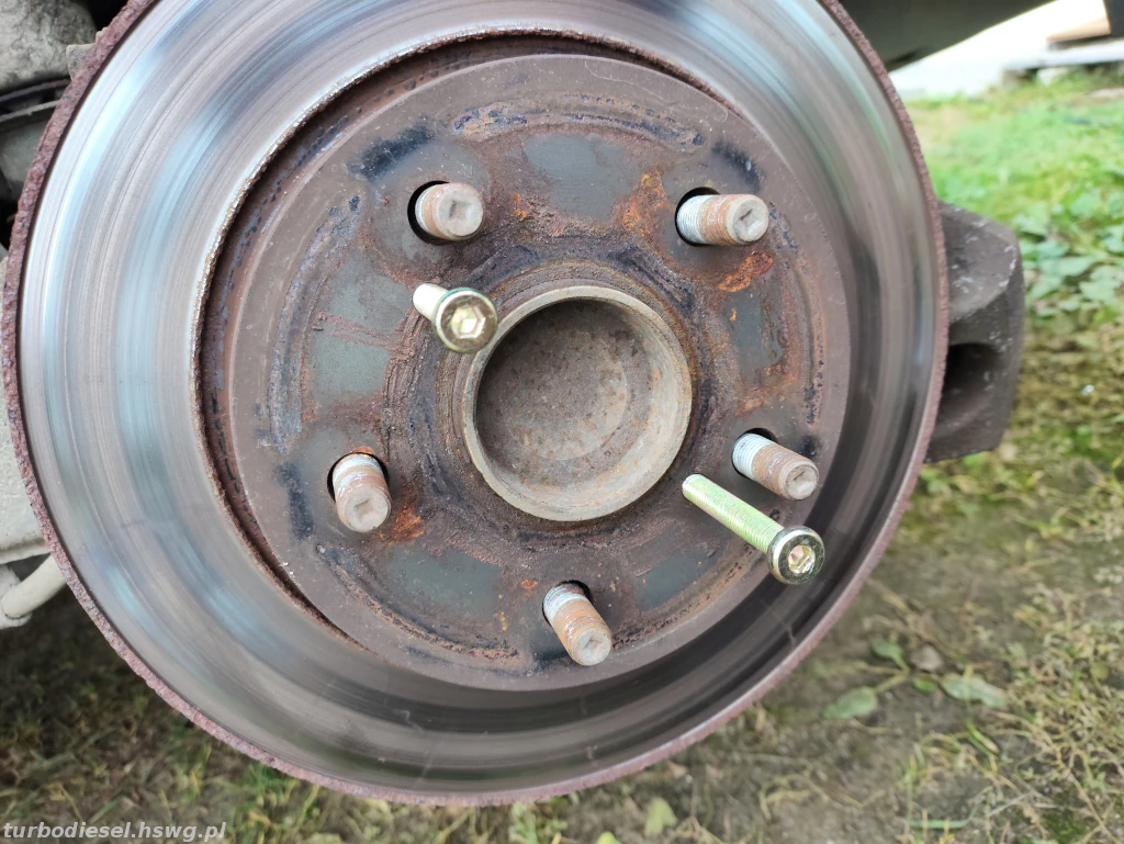 Po założeniu nowej tarczy warto ją dokręcić trzema nakrętkami – nie będzie latała przy montażu jarzma i zacisku.